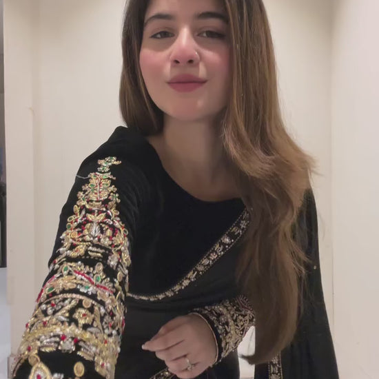Black Pure 9000 Velvet Saree with Heavy Embroidery Lace Border & Full Sleeve Velvet Blouse | Premium Partywear & Wedding Saree