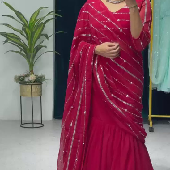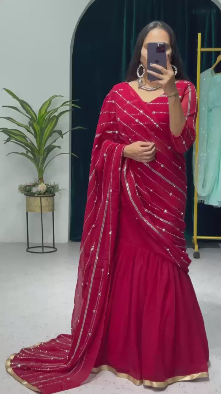 Elevate your festive and wedding wardrobe with this luxurious Faux Georgette Lehenga Saree, crafted to deliver elegance, comfort, and effortless drape. Designed with a beautifully attached pallu, this fusion style combines the richness of a saree with the ease of a lehenga, making it a perfect choice for modern celebrations.