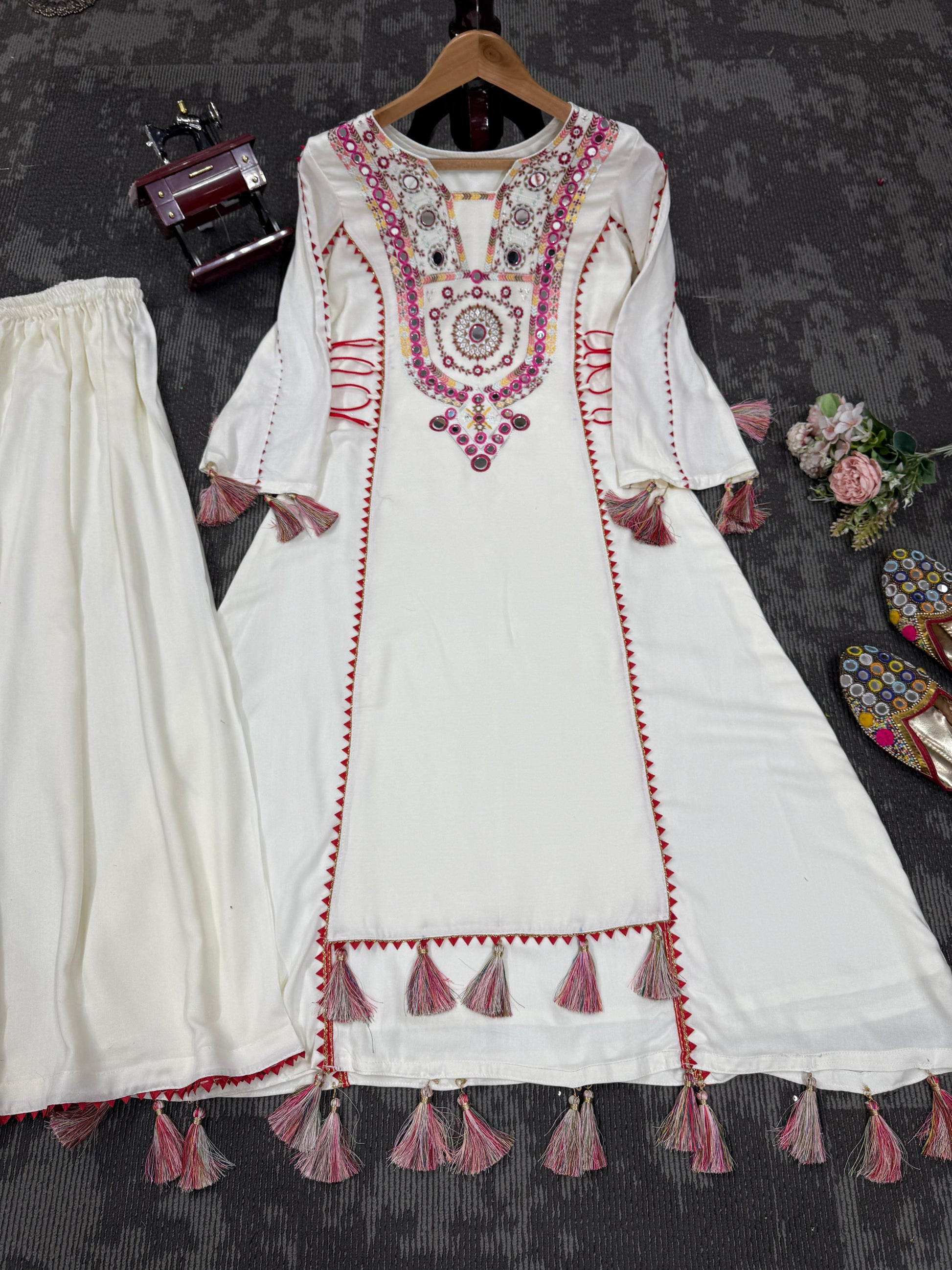 Premium Mirror Work Anarkali Kurti with Plazo for Women | Heavy Rayon A-Line Kurta Set with Tassels | Festive & Party Wear Suit
