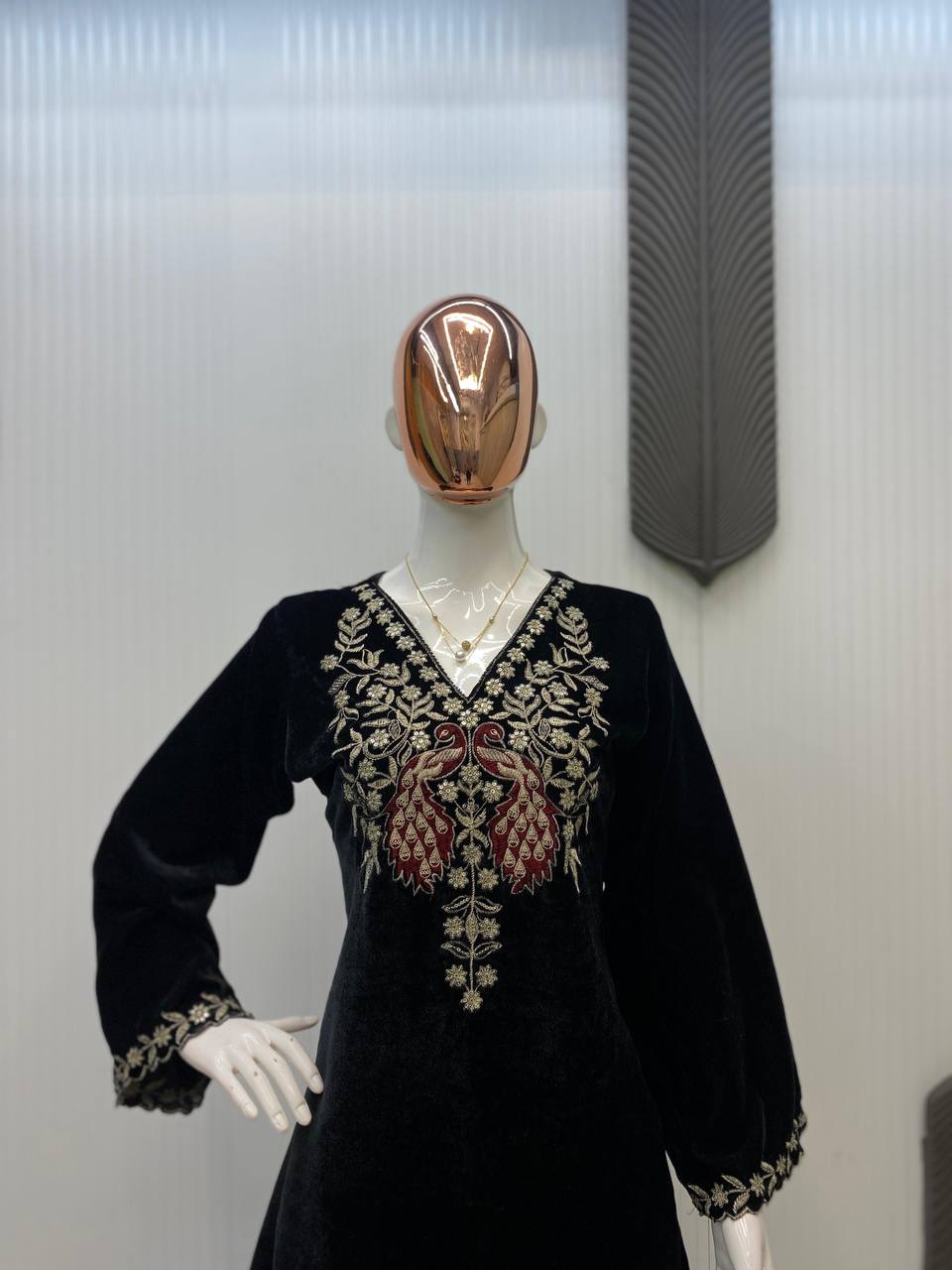 Elegant 2-Piece Set: Beautiful embroidered kurta paired with matching velvet plazzo.